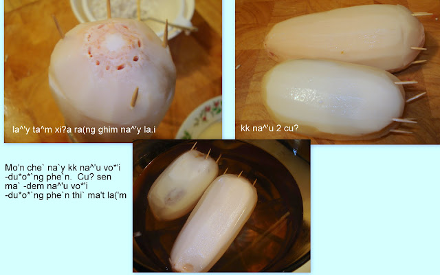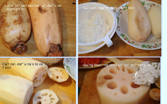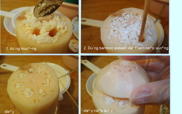 -ACE dùng một cọng que tre (loại mà mình dùng ghim thịt Bar BQ, để help nếp lọt vào lổ của củ sen dễ dàng hơn)