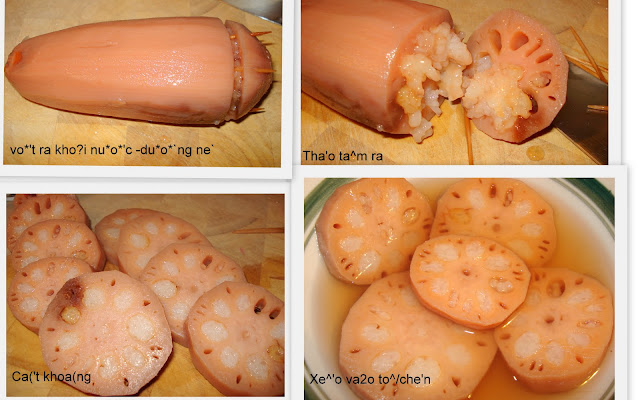 -Bắt nồi nước cho đường vào nấu cho sôi thì thả củ sen nhồi nếp vào nấu 3 tiếng (với lửa nhỏ)