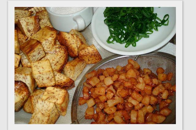 -Bắt chảo lên cho đường vào nấu cho chảy, khi đường chảy vừa hết cho khoai môn đã được hiên sơ vào, đão nhanh tay cho tép mỡ heo và hành lá vào trộn đều lên. Tắt bếp, trút ra dĩa. Khi dùng nó có tí vị ngọt, thơm mùi khoai môn và béo của tép mỡ và hành lá yum.